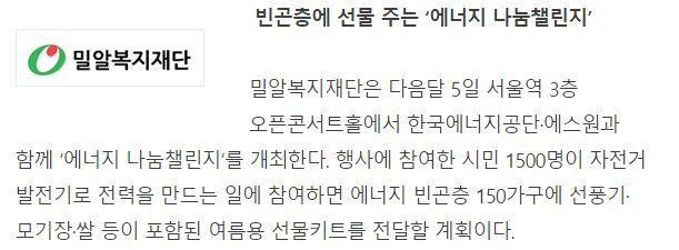 [중앙일보] 빈곤층에 선물 주는 ‘에너지 나눔챌린지’