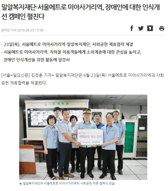 [일요신문] 밀알복지재단-서울메트로 미아사거리역, 장애인에 대한 인식개선 캠페인 펼친다
