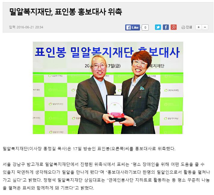 [국민일보] 밀알복지재단, 표인봉 홍보대사 위촉
