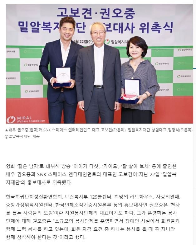 [크리스천투데이] ‘아이가 다섯’ 권오중, 밀알복지재단 홍보대사에 위촉돼