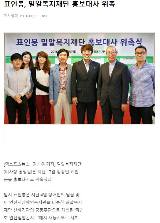 [엑스포츠뉴스] 표인봉, 밀알복지재단 홍보대사 위촉
