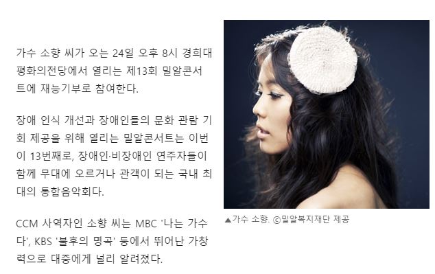 [크리스천투데이] 소향, 장애인들 위해 ‘밀알콘서트’에서 재능기부