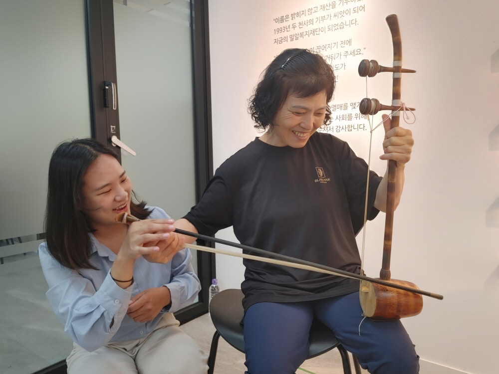 해금 체험을 하고 있는 시청각장애인 박연숙 씨