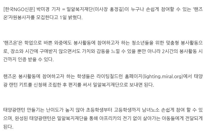 [한국NGO신문] 언제 어디서나 손쉽게… 청소년 봉사활동 프로그램 ‘핸즈온’