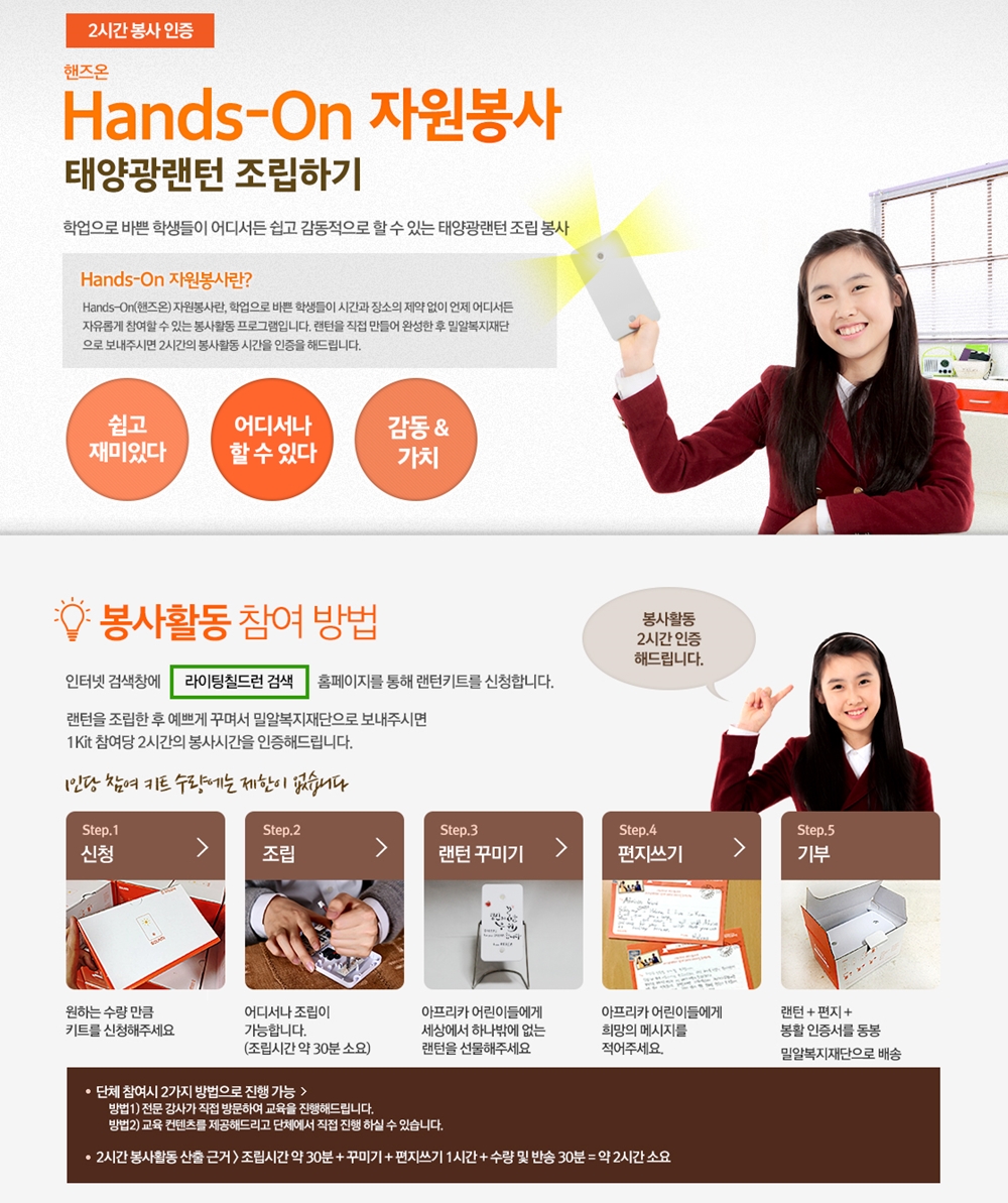 핸즈온 봉사활동에 참여하고자 하는 학생들은 라이팅칠드런 홈페이지(lighting.miral.org)에서 태양광 랜턴 키트를 신청해 조립한 후 편지를 써서 밀알복지재단으로 보내면 된다.