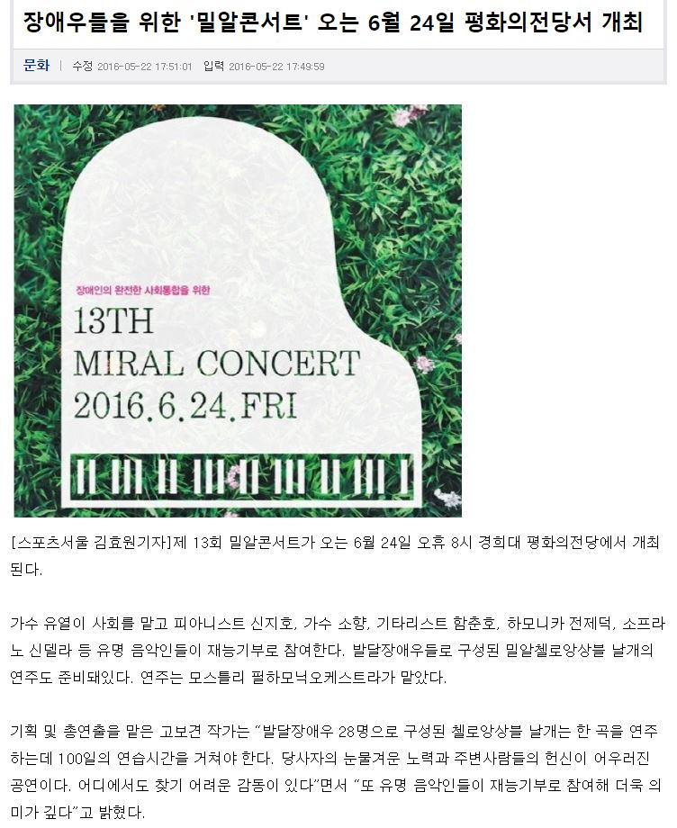 [스포츠서울] 장애우들을 위한 '밀알콘서트' 오는 6월 24일 평화의전당서 개최