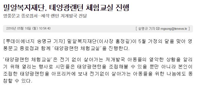 [투데이에너지] 밀알복지재단, 태양광랜턴 체험교실 진행