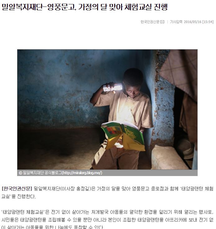 [기독교연합신문] “전기 없이 살아가는 아이들, 나눔에 동참해요”