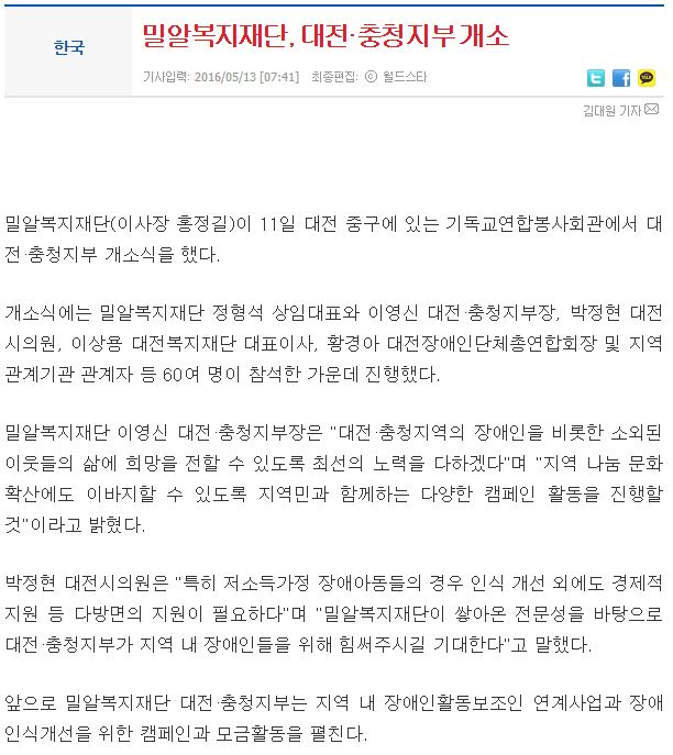 [월드스타] 밀알복지재단, 대전·충청지부 개소