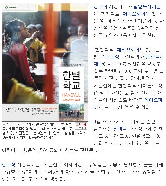 이전 [한국인권신문] 밀알복지재단-신미식 사진작가, ‘한별학교, 에티오피아의 빛나는 별’ 사진전 개최 다음 [크리스천투데이] “내 후원아동의 모습이 궁금하다면”