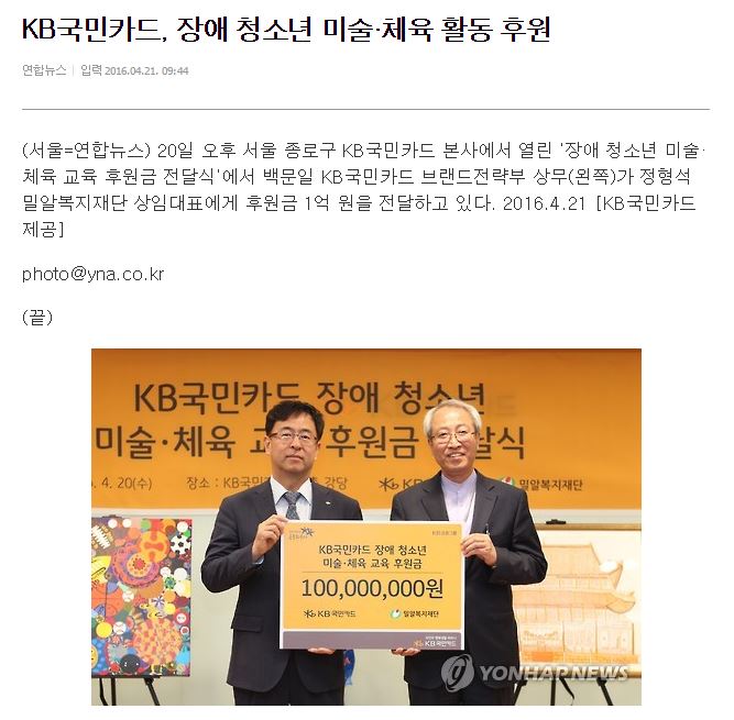[연합뉴스] KB국민카드, 장애 청소년 미술·체육 활동 후원