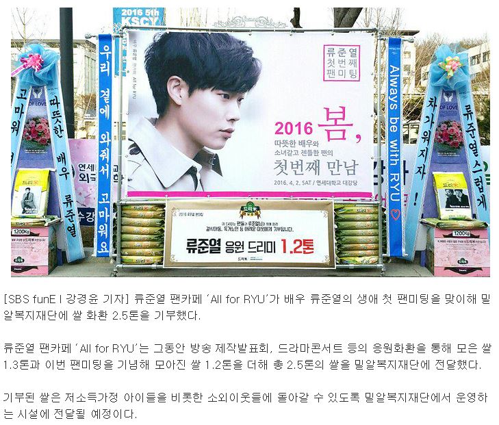 [뉴스엔] 류준열 팬카페, 연이은 나눔 활동 “쌀 2.5톤 기부”