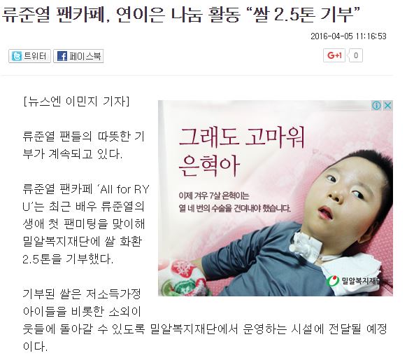 [뉴스엔] 류준열 팬카페, 연이은 나눔 활동 “쌀 2.5톤 기부”