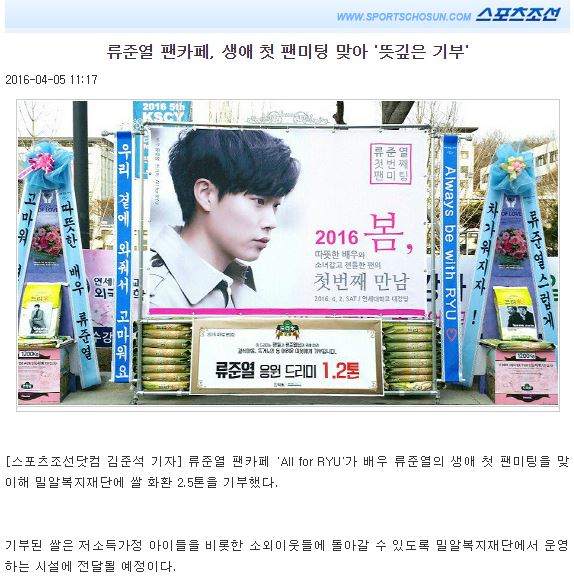 [스포츠조선] 류준열 팬카페, 생애 첫 팬미팅 맞아 '뜻깊은 기부'