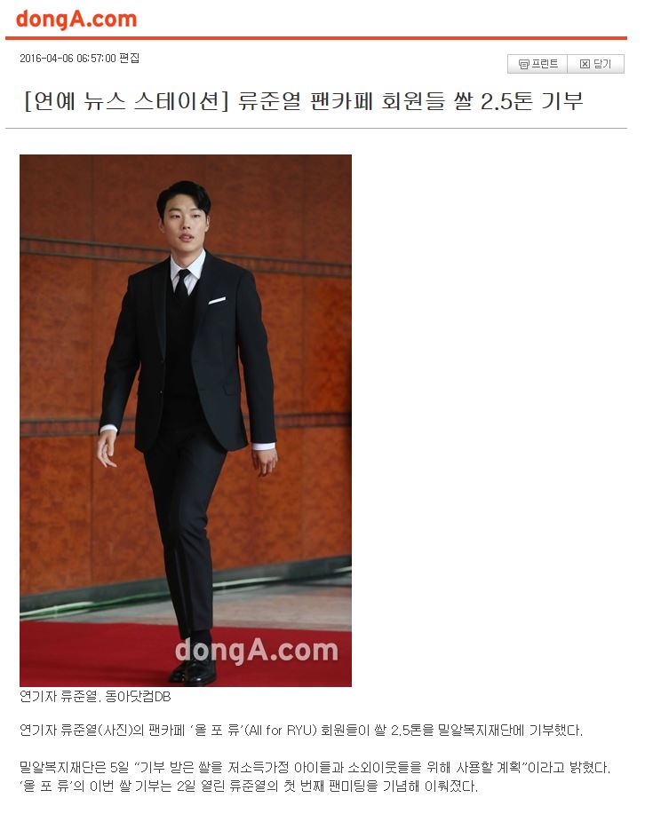 [한겨례] 류준열 팬카페 ‘올포류’, 첫 팬미팅 기념 밀알복지재단에 쌀 2.5톤 기부
