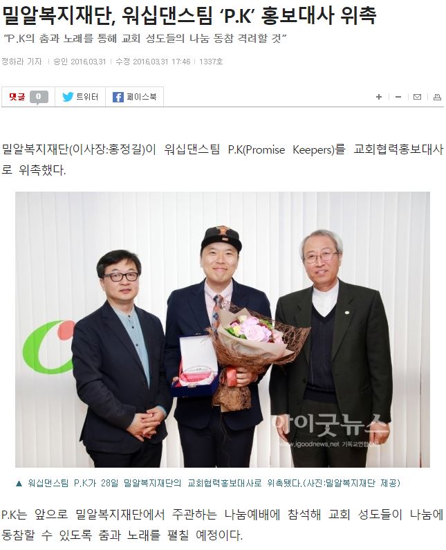 [기독교연합신문] 밀알복지재단, 워십댄스팀 ‘P.K’ 홍보대사 위촉