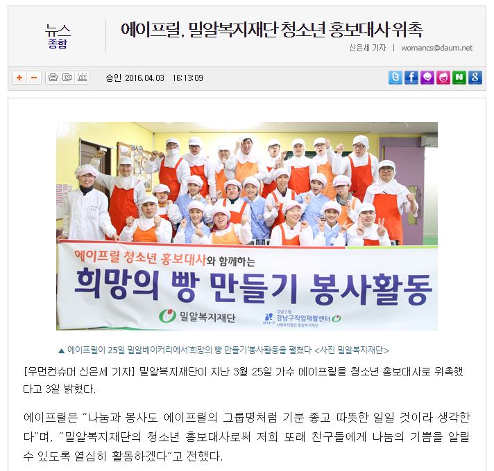[보도기사] 가수 에이프릴, 밀알복지재단 청소년 홍보대사로 위촉