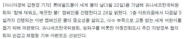 [아시아경제] 롯데월드몰, '함께 채워요, 깨끗한 물' 캠페인 진행