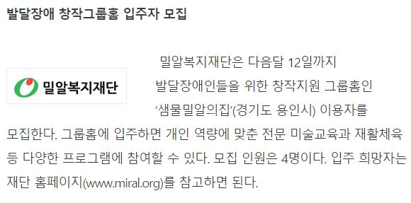 [중앙일보] 발달장애 창작그룹홈 입주자 모집