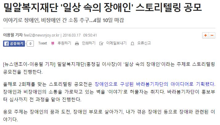 [뉴스앤조이] 밀알복지재단 '일상 속의 장애인' 스토리텔링 공모
