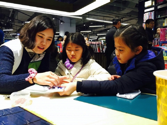 반디앤루니스 센트럴시티점에서 태양광랜턴을 조립하고 있는 아이들