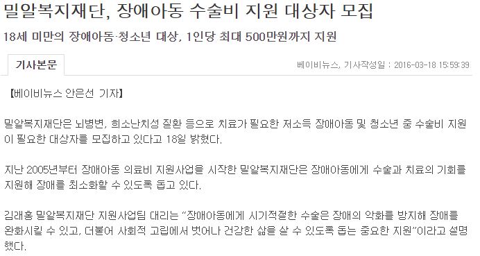 [베이비뉴스] 밀알복지재단, 장애아동 수술비 지원 대상자 모집