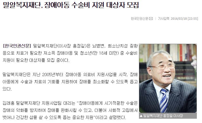 [한국인권신문] 밀알복지재단, 장애아동 수술비 지원 대상자 모집