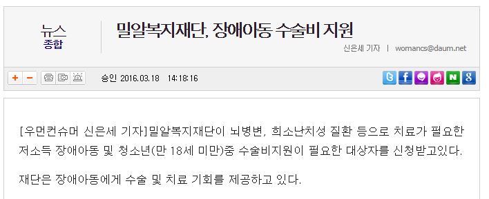 [아침신문] 밀알복지재단, 장애아동 수술비 지원 대상자 모집