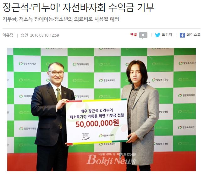 [복지연합신문] 장근석-'리누이' 자선바자회 수익금 기부