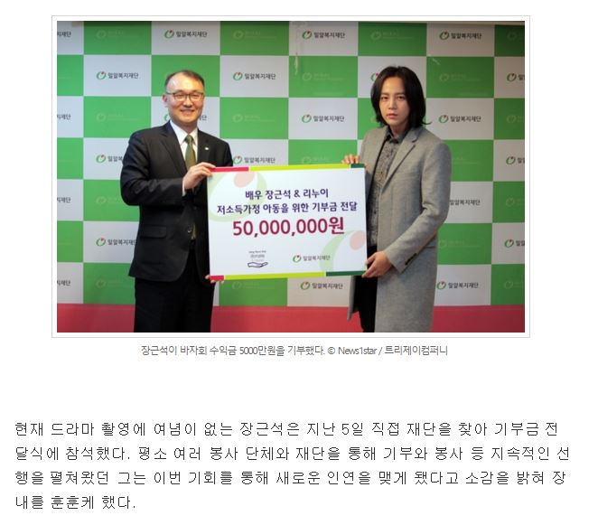 [뉴스1] 장근석, 바자회 수익금 5천만원 기부 '꾸준한 선행'