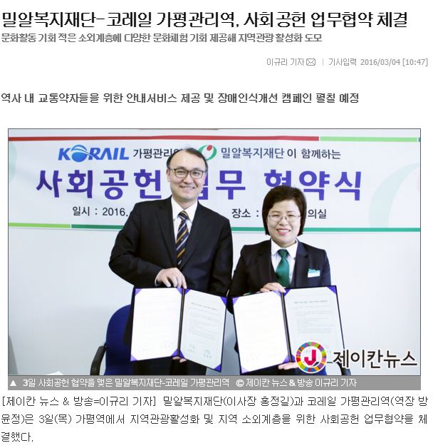 [제이칸뉴스] 밀알복지재단-코레일 가평관리역, 사회공헌 업무협약 체결