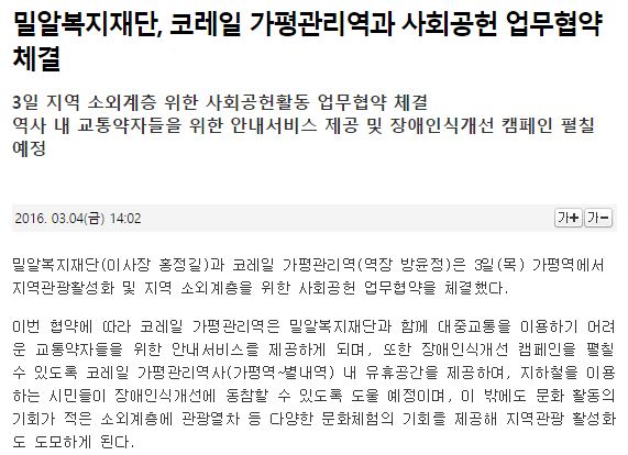[아침신문] 밀알복지재단, 코레일 가평관리역과 사회공헌 업무협약 체결