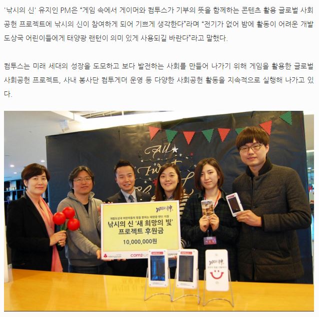 [동아일보] 컴투스의 '낚시의 신', 저개발국가 태양광 랜턴 후원금 전달