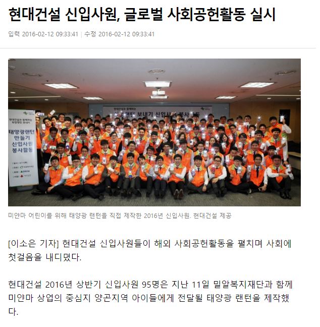 [이투데이] 현대건설 신입사원, 글로벌 CSR활동으로 사회 ‘첫걸음’