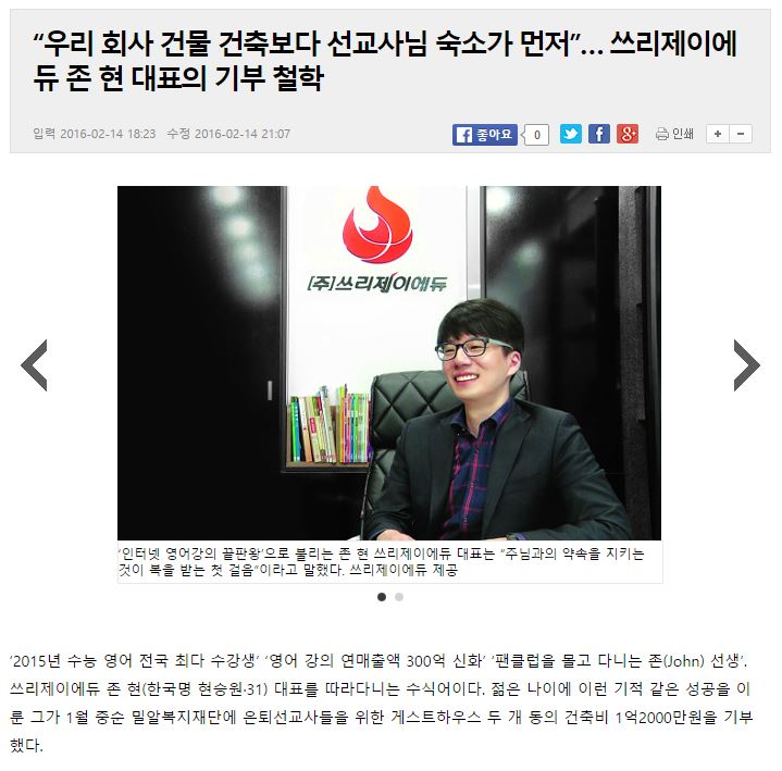 [국민일보] “우리 회사 건물 건축보다 선교사님 숙소가 먼저”… 쓰리제이에듀 존 현 대표의 기부 철학