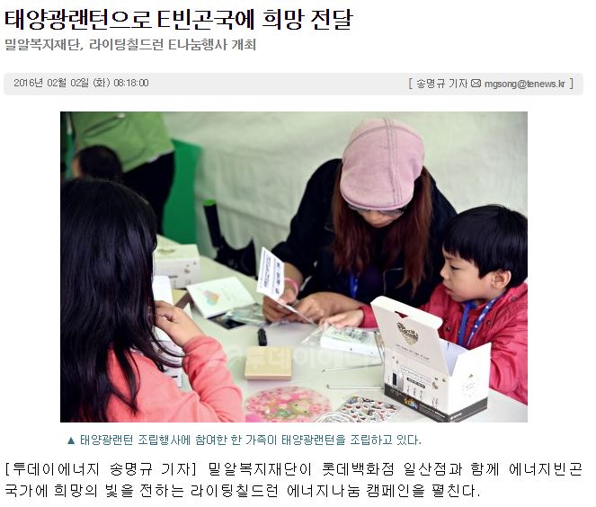 [투데이에너지] 태양광랜턴으로 E빈곤국에 희망 전달