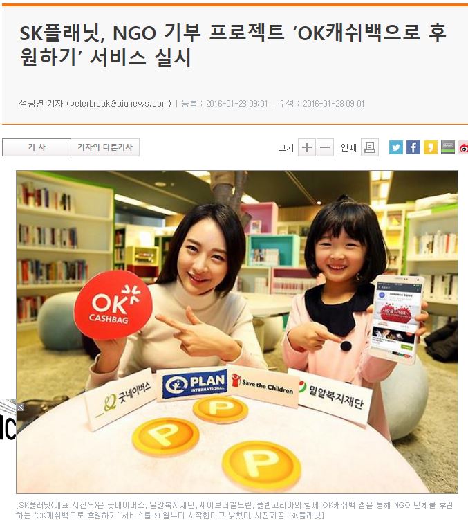 [아주경제] SK플래닛, NGO 기부 프로젝트 ‘OK캐쉬백으로 후원하기’ 서비스 실시