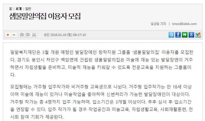 [기독신문] 샘물밀알의집 이용자 모집