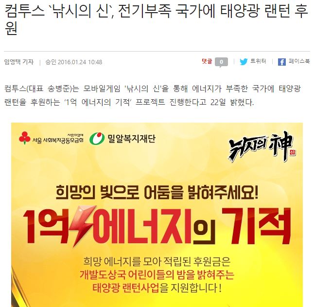 [매일경제] 컴투스 `낚시의 신`, 전기부족 국가에 태양광 랜턴 후원