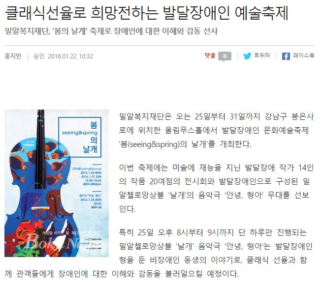 [한국사진방송] 발달장애인 미술전시·음악극 열린다…밀알복지재단, 예술축제 ‘봄의 날개’ 개최