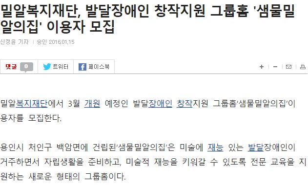 [굿데일리] 밀알복지재단, 발달장애인 창작지원 그룹홈 '샘물밀알의집' 이용자 모집