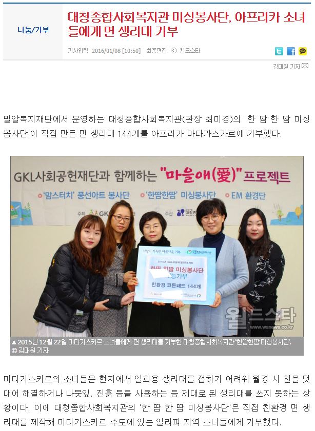 이전 [제이칸뉴스] 아프리카 소녀들에게 '한땀 한땀' 만든 면생리대 기부 다음 [한국NGO신문] 대청종합사회복지관 미싱봉사단 아프리카 소녀들에게 면생리대 기부