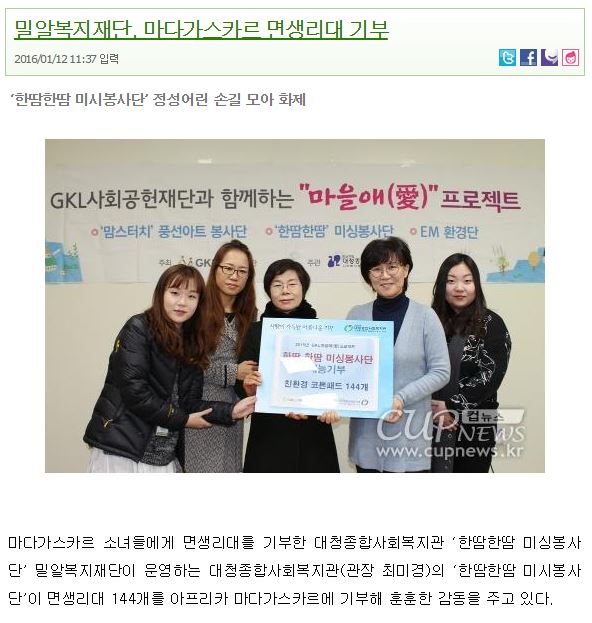 [뉴스투데이] 대청종합사회복지관 미싱봉사단, 아프리카 마다가스카르에 면생리대 기부