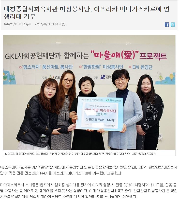 [뉴스투데이] 대청종합사회복지관 미싱봉사단, 아프리카 마다가스카르에 면생리대 기부