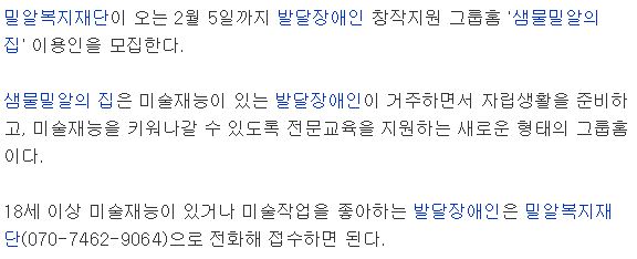 [에이블뉴스] 발달장애 창작지원 그룹홈 '샘물밀알의 집' 이용인 모집
