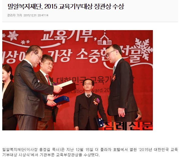 [주간침례신문] 밀알복지재단, 2015 교육기부대상 장관상 수상