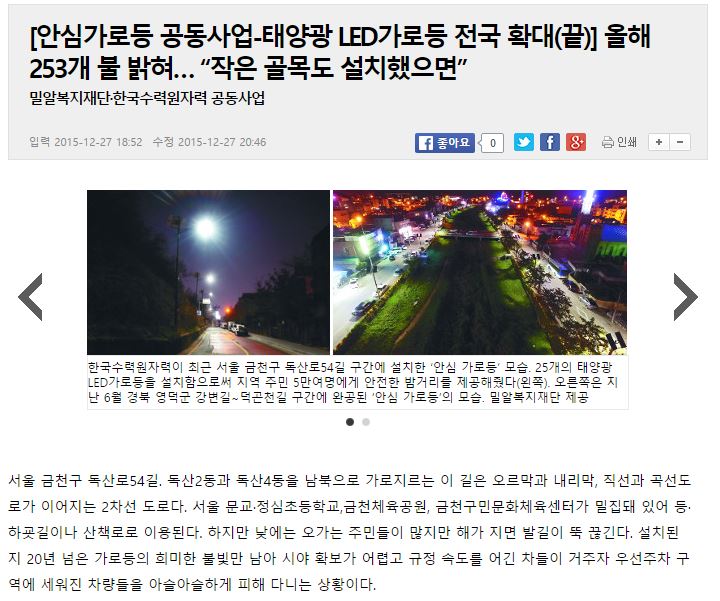 [국민일보] [안심가로등 공동사업-태양광 LED가로등 전국 확대(끝)] 올해 253개 불 밝혀… “작은 골목도 설치했으면”