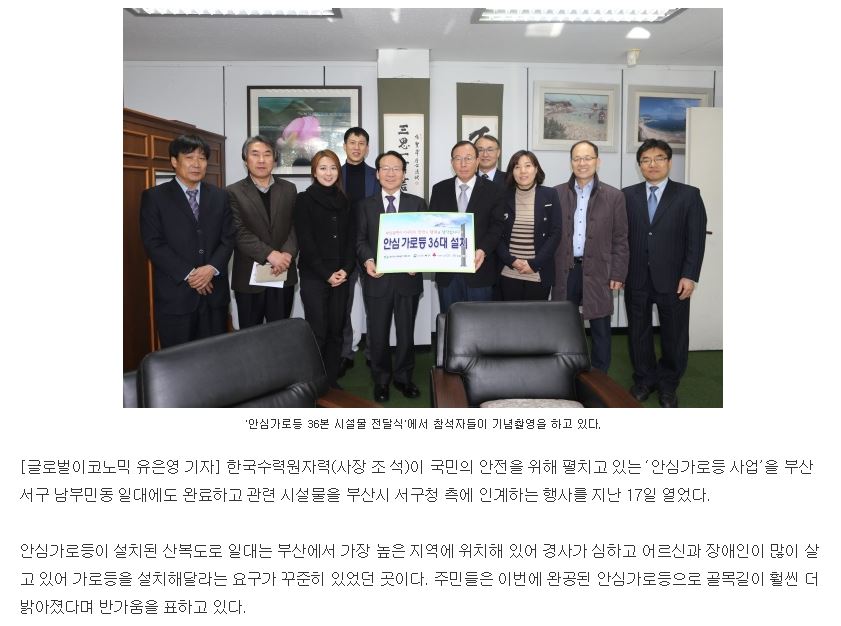 [글로벌이코노믹] 한수원, 부산 남부민동 골목길에 '안심가로등' 36개 설치