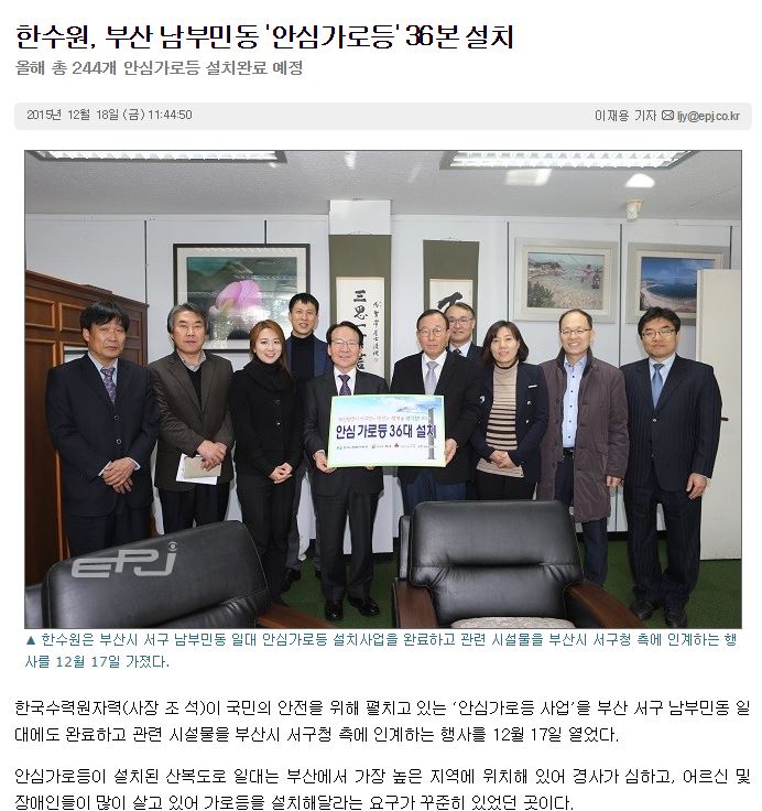 [일렉트릭파워] 한수원, 부산 남부민동 '안심가로등' 36본 설치