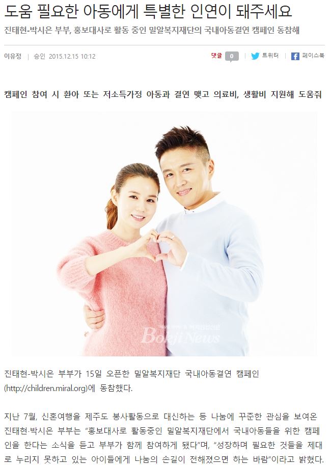 [복지뉴스] 진태현-박시은 부부, 밀알복지재단 국내아동결연 캠페인 동참